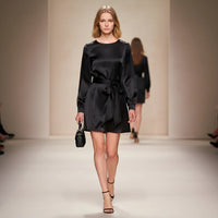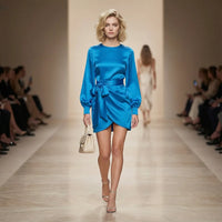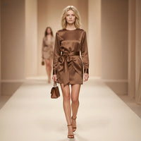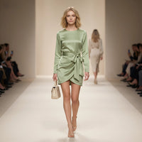 Zenova SatinSculpt™ – O-Neck Long-Sleeve Ruched Tie Mini Dress
