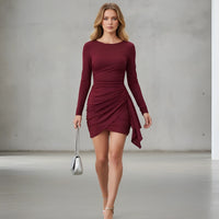 Designed to make a statement, this long-sleeve bodycon mini dress combines modern sophistication with effortless sex appeal. The sleek O-neckline and slim sheath silhouette create a clean, elegant profile, while the ruched side detailing subtly defines the waist and enhances your natural curves.